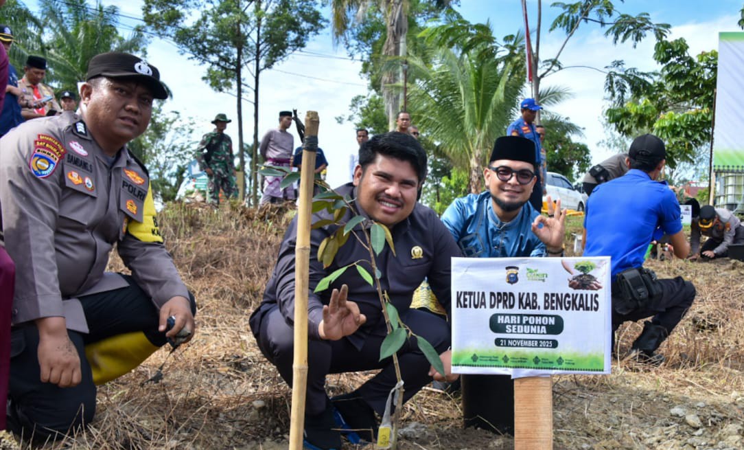 Pada kesempatan yang sama, Wakil Ketua I DPRD Kabupaten Bengkalis, M. Arsya Fadillah, menegaskan bahwa kegiatan penanaman pohon tidak hanya menjadi agenda seremoni, tetapi merupakan komitmen bersama untuk merawat bumi secara berkelanjutan. Ia menilai bahwa menjaga alam dapat dimulai dari langkah sederhana seperti menanam pohon, sejalan dengan tema “Workshop Green Policing”.